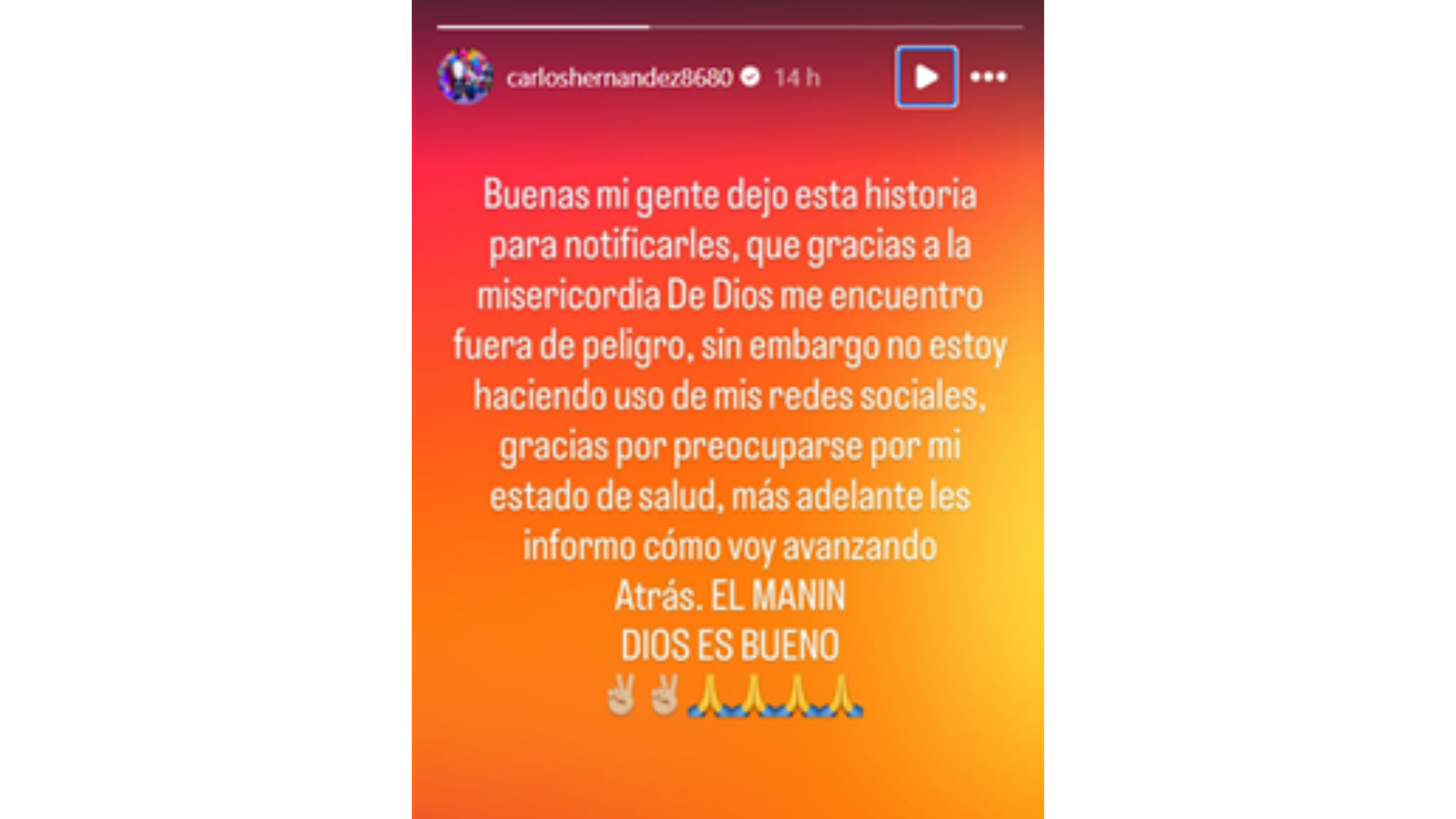 Luego de varias jornadas de silencio y evolución clínica, Hernández utilizó su cuenta de Instagram para comunicarse directamente con su fanaticada.
